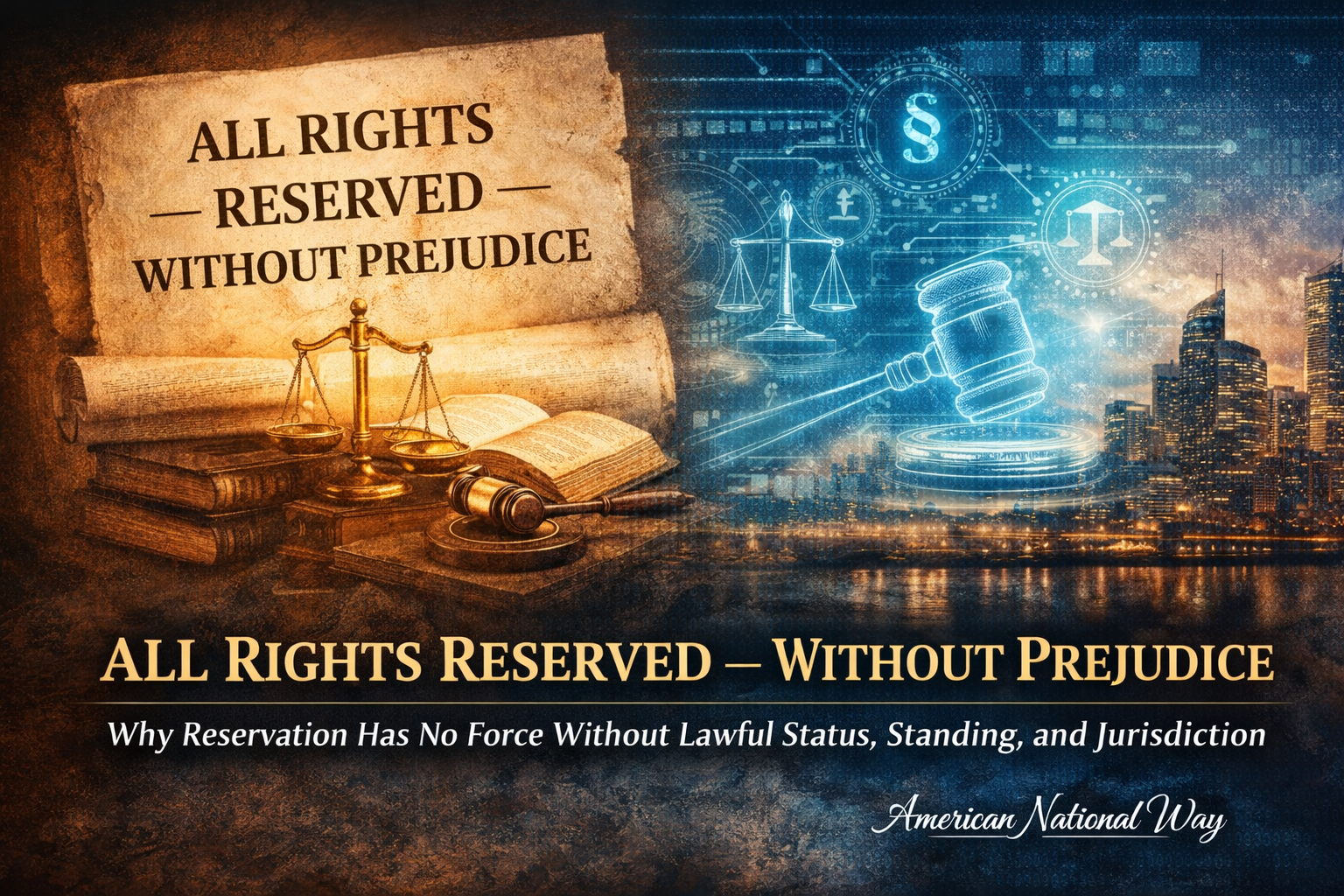 “All Rights Reserved — Without Prejudice” did not emerge from mysticism, rebellion, or clever wordplay. It emerged as a defensive response within a legal-administrative system that defaults to presumption, implied consent, and commercial capacity. The phrase attempts to limit waiver and prevent silence from being interpreted as assent. However, reservation alone does not create rights. It can only preserve what already exists.